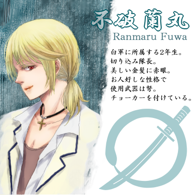 『白軍に所属する2年生。切り込み隊長。美しい金髪に赤眼。お人好しな性格で使用武器は弩(ど)。チョーカーを付けている。』(ユウキで調べたよ)