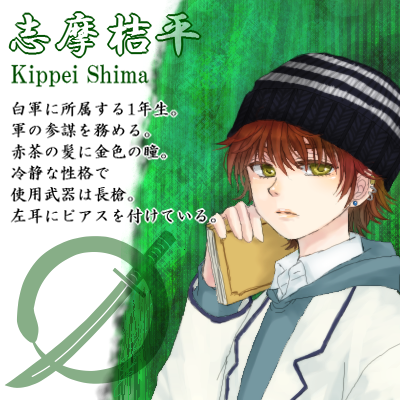 『白軍に所属する1年生。軍の参謀を務める。赤茶の髪に金色の瞳。冷静な性格で使用武器は長槍。左耳にピアスを付けている。』(YOUKIで調べたよ)