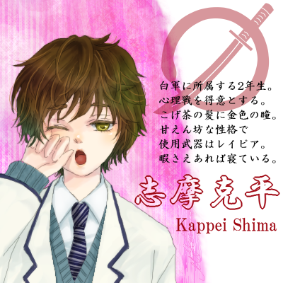 『白軍に所属する2年生。心理戦を得意とする。こげ茶の髪に金色の瞳。甘えん坊な性格で使用武器はレイピア。暇さえあれば寝ている。』(ゆうきで調べたよ)