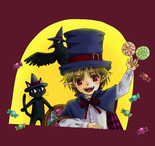そうそう、なんか飾りにでもってお化けとか蝙蝠とかお菓子とか描いたんですけど、お菓子がまー浮いてるなぁと思ったので、飴を降らしてなじませたろうという計画があったんですけど(吸血鬼くんはものすごくいいように使われていたw)、全くそのことをしまこさんに伝えてなかったんです。しかしまるで打ち合わせしたかのような飴ちゃんの使い方!しまこさんと心が通じ合ったわって感動してました^o^