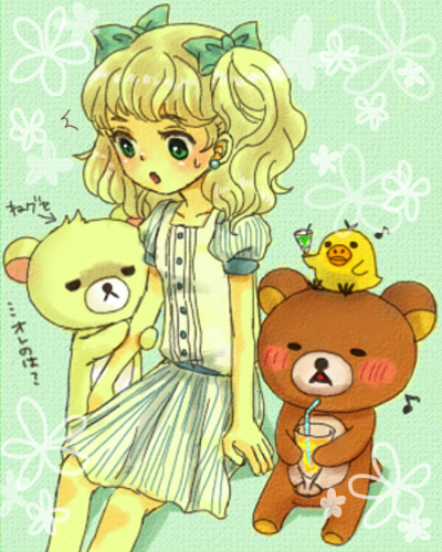 お昼寝から起きたリラックマとキイロトリにジュースあげてたら、後から起きてきたコリラックマにメンチ切られるの図。