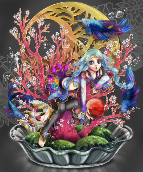 宝玉卵とか、月のモチーフに絡めた設定とかもほぼ線画ありきで浮かんでるので、しゃちさんの線画のふところの広さに感謝ですね!しゃちさんが月に模様入れようと思ってたって言ってたのを見て、私も装飾ちっくな月にしようと思ったりとか…て訳であんまり独創性はないです^p^{しゃちさん頼り!w